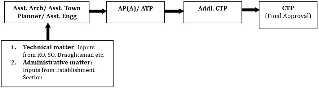 All the matters pertaining to the Department are addressed to the Head of Department (HOD). The HOD directs the matters to the Additional CTP. As per the subject, it is assigned to AP(A)/ ATPs on a case to case basis. The matter is further handed down to the Assistant Architects/ Assistant Town Planners etc., who then process it upwards to the AP(A)/ ATP, Additional CTP and then to the HOD for Departmental approval. If the matter is technical, then support/ input of RO, SO, Draughtsman etc. are taken. If the matter pertains to administrative/ finance aspect, then support of Establishment section is taken. Work flow is shown below: